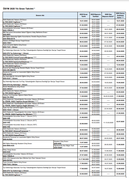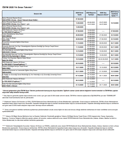 2025 yılında ÖSYM tarafından uygulanacak olan sınavlara ilişkin “ÖSYM 2025 Yılı Sınav Takvimi”ne 13 Kasım 2024 günü saat 11.15‘ten itibaren ÖSYM’nin https://www.osym.gov.tr adresinden erişilebilecektir.